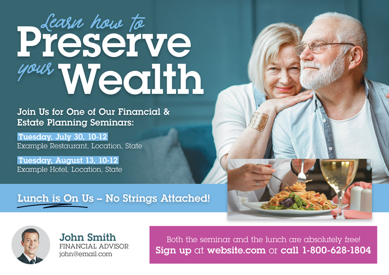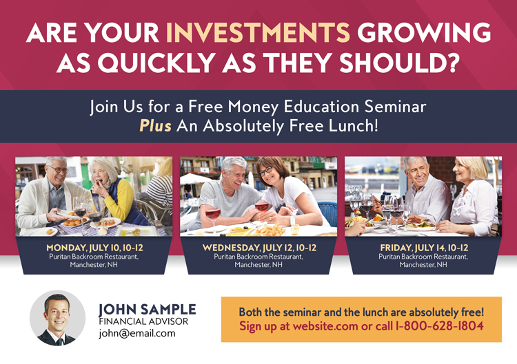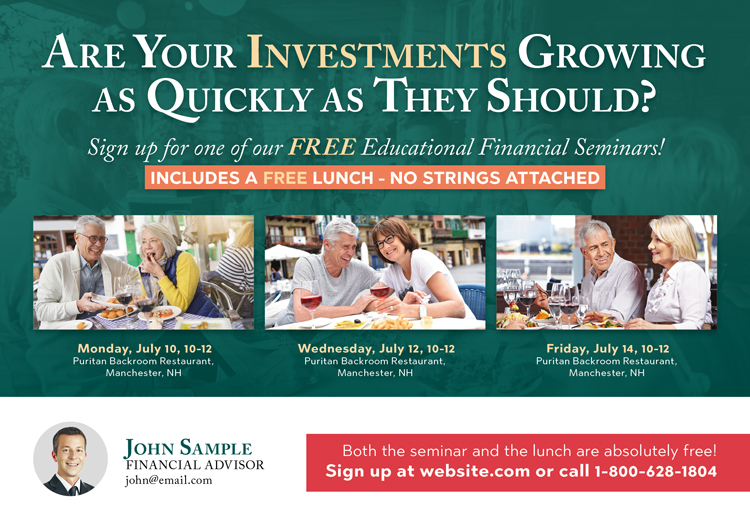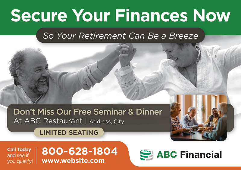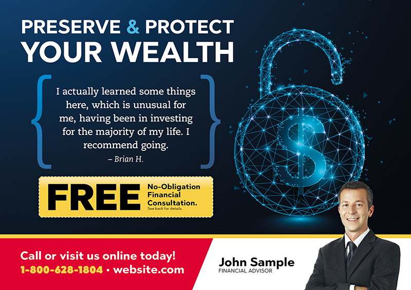 While you are helping others get the most from their income, you need someone to help you maximize yours! We have worked with hundreds of financial advisors, retirement planners, and investment brokers, and we have tracked the data from all of those campaigns. Above you’ll find examples of the cards our actual clients have used with spectacular results. You can use any sample design you see for your own business and customize it with your logo. Or, if you prefer, we can design you a brand new card from scratch. Simply use the arrows to scroll through the gallery, and don’t forget to further your marketing education with the amazing resources at the bottom of the page!