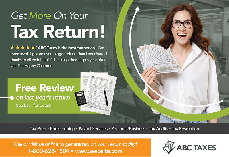You spend all day helping people keep more of their money. Isn’t it time your marketing plan produced more money for your tax office? On this page you’ll find postcards that are PROVEN to work — we know, because we have helped more than 3,500 accountants and tax service clients with their marketing, and have tracked the results of those campaigns. You can use any of these postcard templates for your business (we can customize them with your logo and text), or if you’d rather create your own unique postcards or flyers, we can design them from scratch! At PostcardMania, we do more than create results-driven postcards. We’re a full-service marketing company that helps small business with every aspect of their marketing strategies. If you are an accountant or tax preparer looking for marketing ideas and you’re reading this, you’re on the right track! Just call our consultants at 1-800-628-1804 to get started!