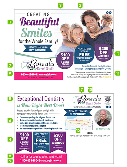 In addition to their weekly briefing, our graphic artists use a 12-point checklist to guide their postcard designs. The checklist was created by our CEO, Joy Gendusa (who started her career as a graphic designer, by the way!) and details the 12 elements that have proven to generate the best results.