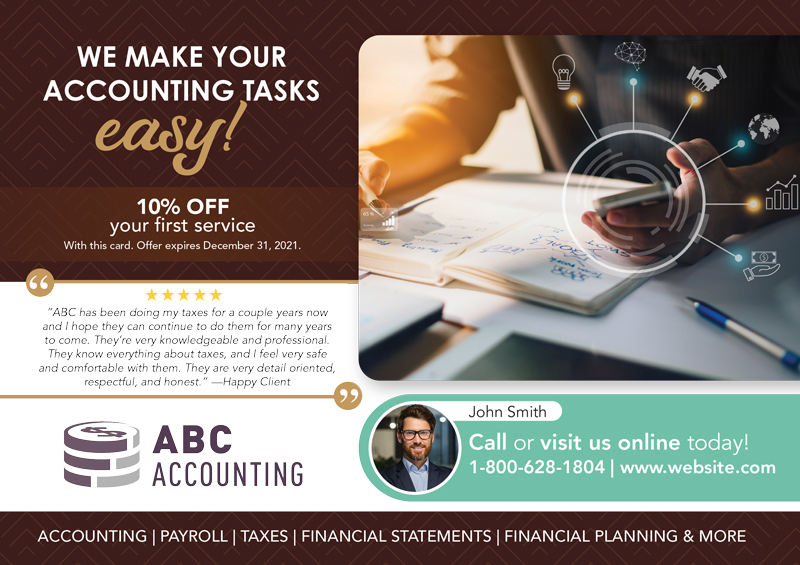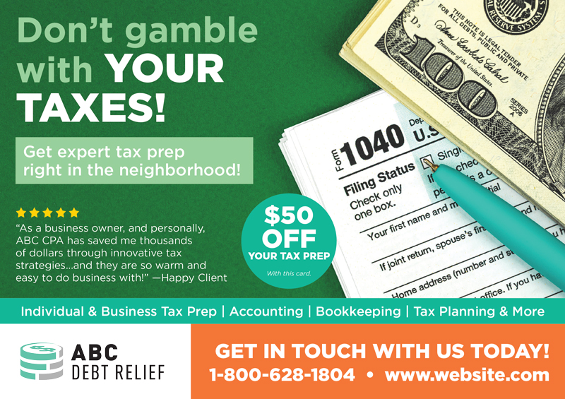 If you’re looking for a marketing plan for tax preparation business, we have multiple options available for you. We have worked with hundreds of accountants, CPAs, and financial professionals, and we have tracked the data from those campaigns. Below you’ll find marketing ideas for tax service and examples of the cards our actual clients have used with spectacular results. You can use any sample design you see for your own business and customize it with your logo. Or, if you prefer, we can design you a brand new card from scratch. Simply use the arrows to scroll through the gallery, and don’t forget to further your marketing education with the amazing resources at the bottom of the page!
