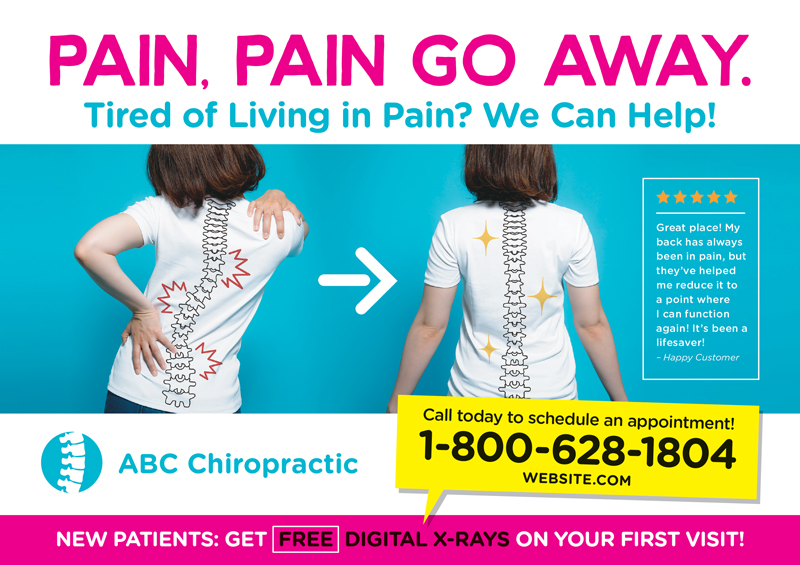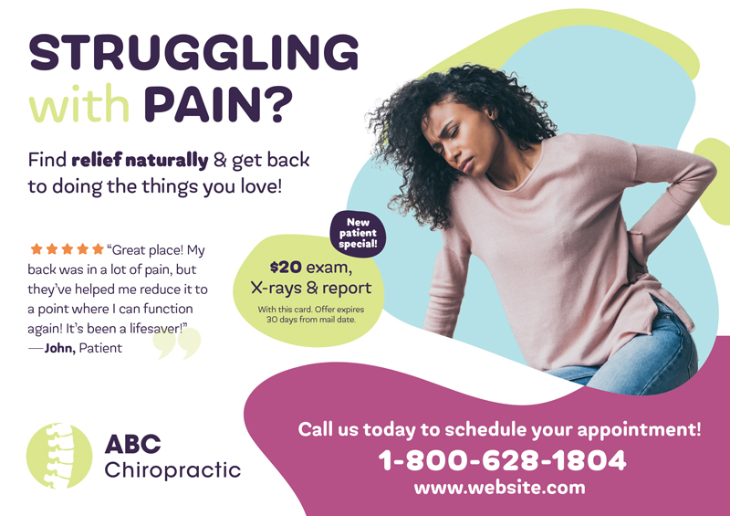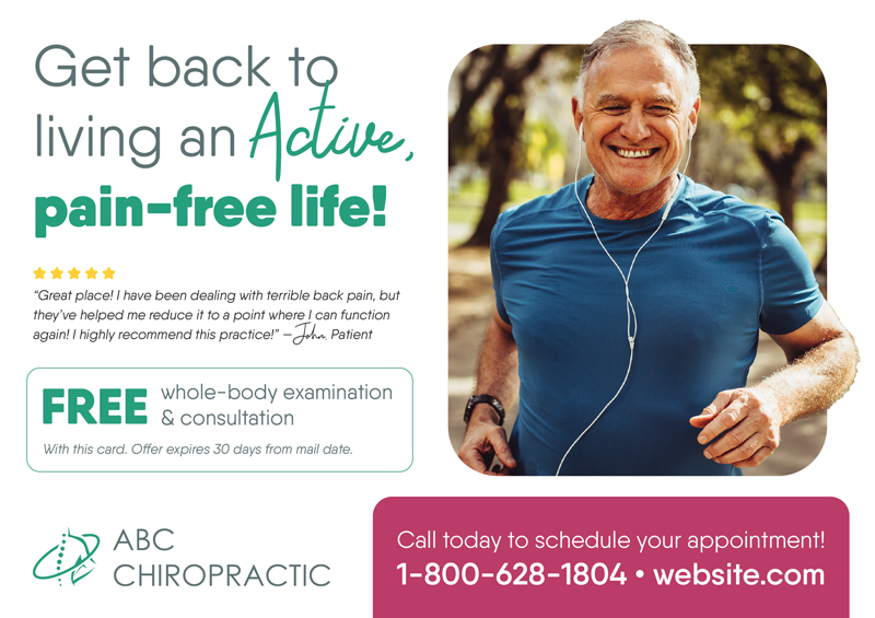 Marketing for chiropractors is extremely important and should be tailored to every office’s specific needs and goals. We have worked with hundreds of chiropractic professionals, and we have tracked the data from all of those campaigns. By browsing through our chiropractic marketing template library, you’ll see chiropractic postcards and chiropractic marketing ideas for your particular business. Select any postcards for chiropractic patients or offices and then we’ll customize it with your business name, logo, contact information, and imagery. All of these chiropractic marketing strategies bring in big results. Additionally, if you decide you want a custom chiropractic advertising direct mail campaign, we can design a piece for you from scratch. You can scroll through our gallery and then visit these links for more chiropractic advertising: Chiropractic Marketing Ideas and Chiropractic Postcards.