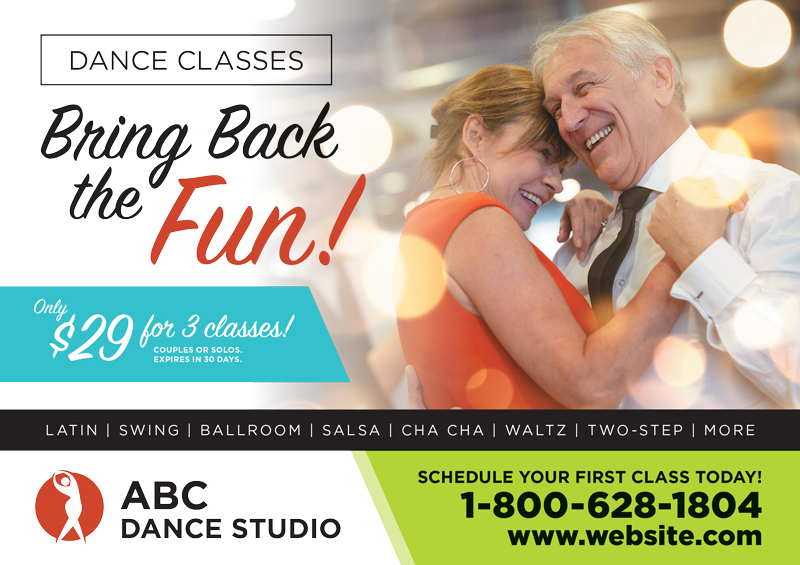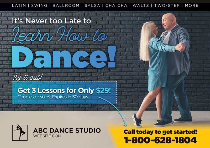 If you’re looking to learn how to advertise dance classes, we have hundreds of dance studio marketing ideas to get you started! Our direct mail and integrated marketing campaigns have been tested to deliver success and increase annual revenue. You can run a dance studio marketing strategies with dance studio postcards selected from our template library, or use a custom design tailored by our graphic designers. We’ll even run dance studio advertising on social media for you in tandem with your postcards to bring in more leads.