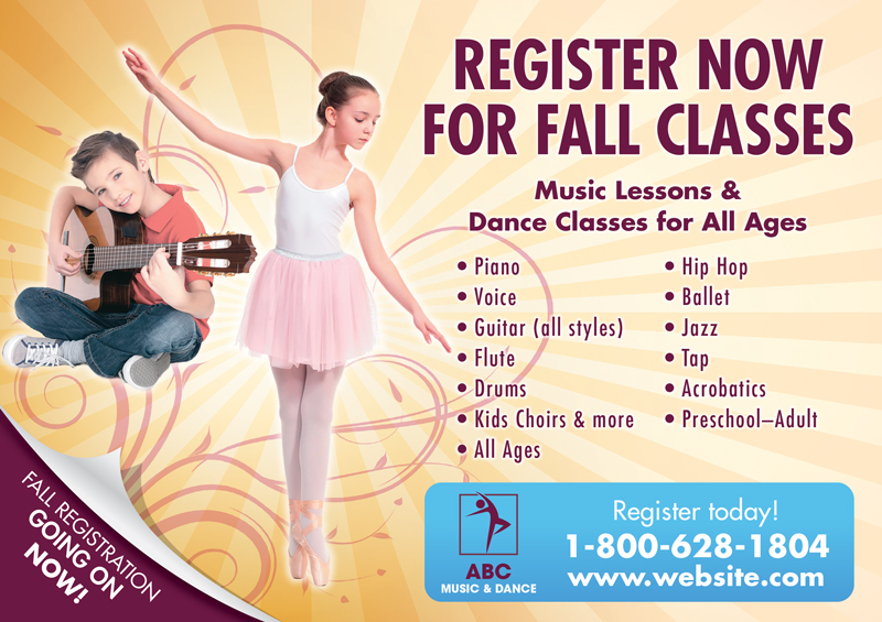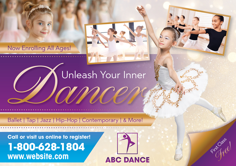 You can use these dance studio postcard templates for your dance studio ads or customize them with your own logo and copy — or we can create one for you from scratch. You can also check out these 7 Easy Dance Studio Marketing Ideas.
